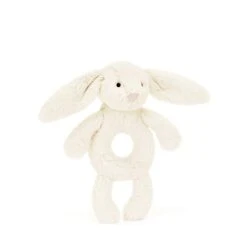 A treat for tiny hands, Bashful Cream Bunny Ring Rattle can be grabbed by its soft paws, long lop ears or ring-shaped tummy. When given a gentle shake it will sound the rattle, inside much to baby’s delight! Crafted in soft, cream coloured fur made from recycled fibres featuring a Bashful Bunny pink suedette nose and embroidery eyes.