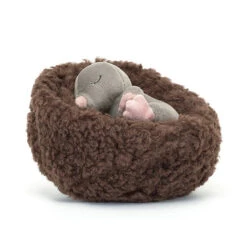 Quiet, everyone – it’s Hibernating Mole! This gentle dreamer has stretchy grey fur, pink nose and paws and embroidered closed eyes. Lift this little one out of their fleecy cocoa nest, but be careful not to wake them up!
