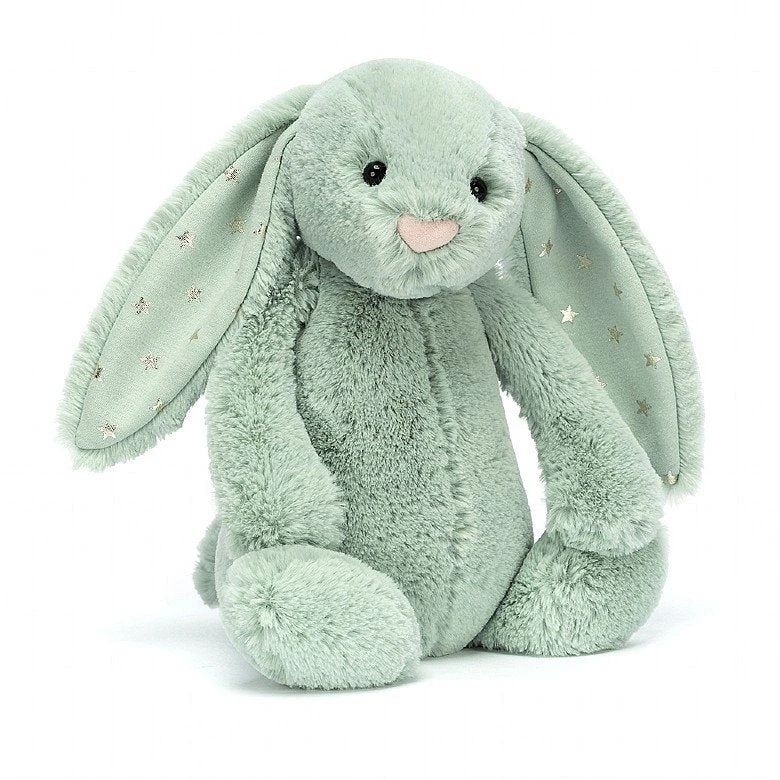 Sliding in on a moonbeam, Bashful Sparklet Bunny is dreamy-soft in soothing sage fur. This beautiful bunny has long, flopsy ears, speckled with silvery stars. Cuddle close for enchanted slumbers and nuzzles from that suedey pink nose. Make a wish together!