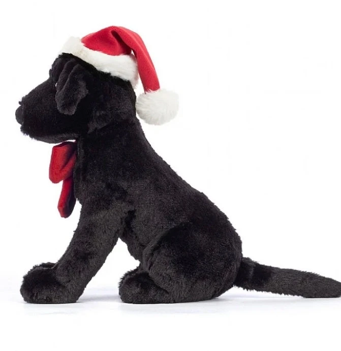 Winter Warmer Pippa Black Labrador is so excited for the winter season! This floppy-eared pup has hazel eyes, a fetching red bow and a fleece-trimmed hat. Pippa sits up keenly with her long tail behind her, chunky nose sniffing for Christmas dinner!